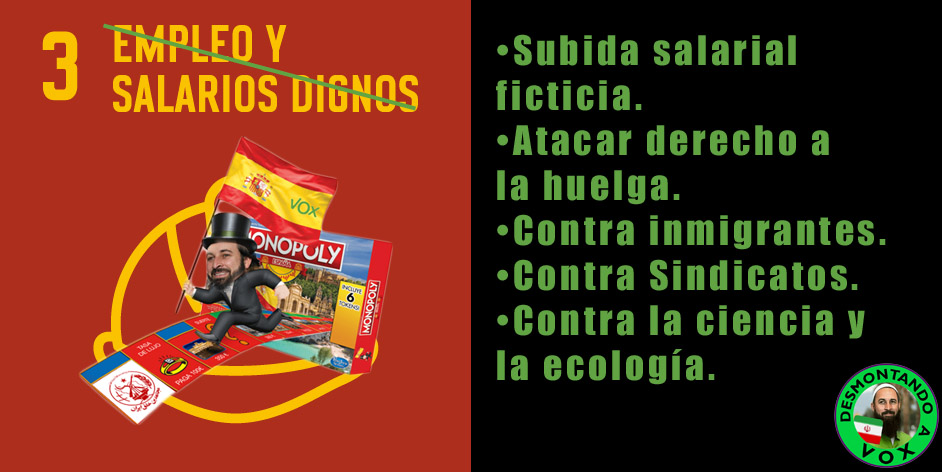 VOX propone impulsar la subida de todos los salarios «especialmente los más bajos». Pero VOX se opone a la subida del SMI (opinando, contra el reciente Nobel de economía, que eso perjudica al empleo). Para explicar cómo conseguiran compatibilizar ambas cosas, lo que proponen es reducir cotizaciones e impuestos. Es decir, acabar con el estado del bienestar.