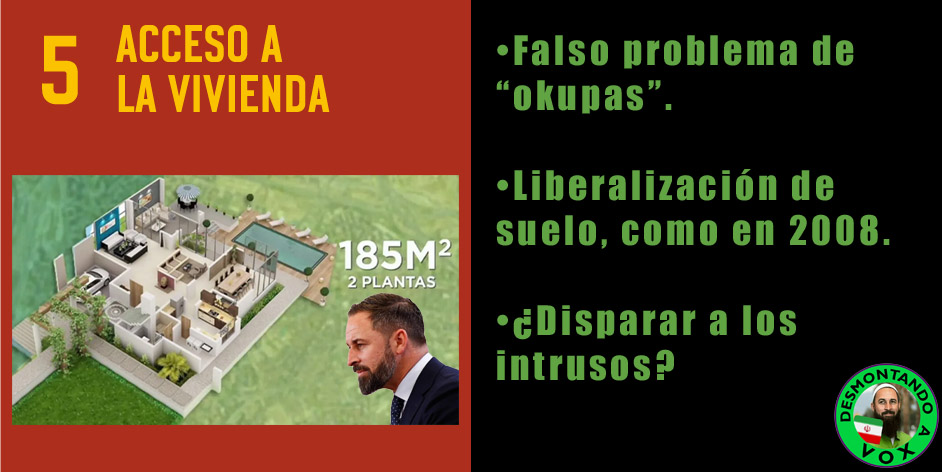 Otras medidas son la reducción de impuestos (una vez más atacando al estado del bienestar) y la construcción de viviendas sociales. No se habla de las viviendas en manos de especuladores. ¿Tendrá que ver que el alojamiento web de VOX estuviera pagado por una constructora?