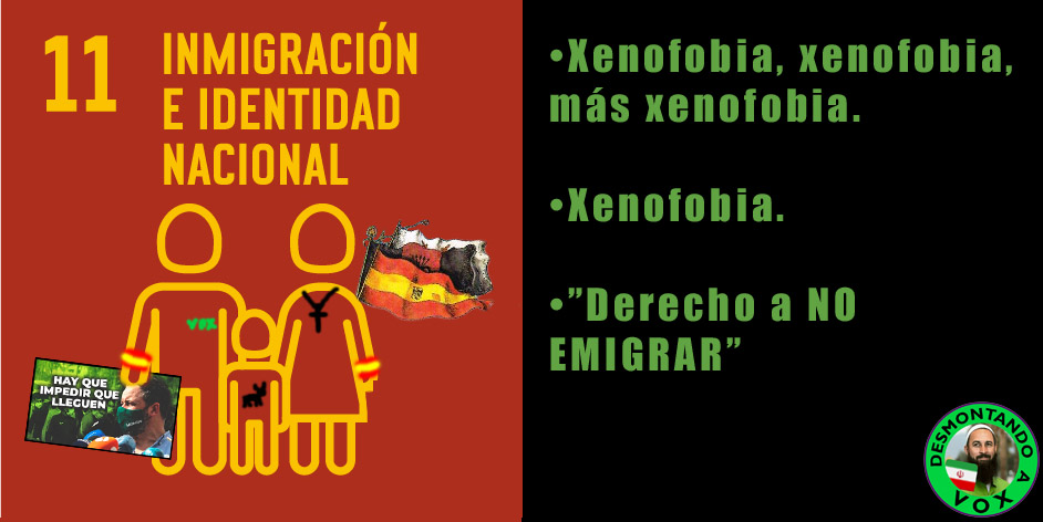 Efectivamente, un discurso xenófobo mezclado con conspiranoia (esas «políticas contrarias a la familia» que existen solo en sus cabezas, esos países donde -según ellos- ha fracasado el multiculturalismo), en el que juntan sus consabidas expulsiones, sus bulos sobre las «paguitas», sus ataques a menores, etc. Eso sí, hacen distinciónes. No todos los extranjeros son iguales, se discrimina más si no proceden de eso que han inventado a lo que llaman «Iberosfera».