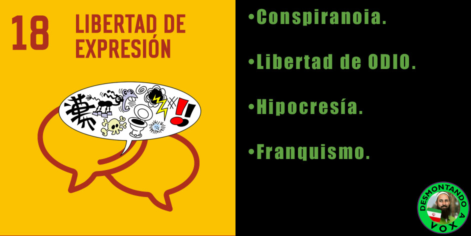 Volvemos a las perversiones del lenguaje tan típicas de VOX. Para empezar, sepamos que cuando VOX reclama «Libertad de expresión«, lo que reclama es que no se persigan «delitos de odio». Literalmente, es el último párrafo de este punto en la «agenda».