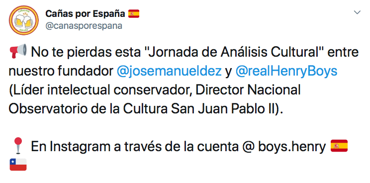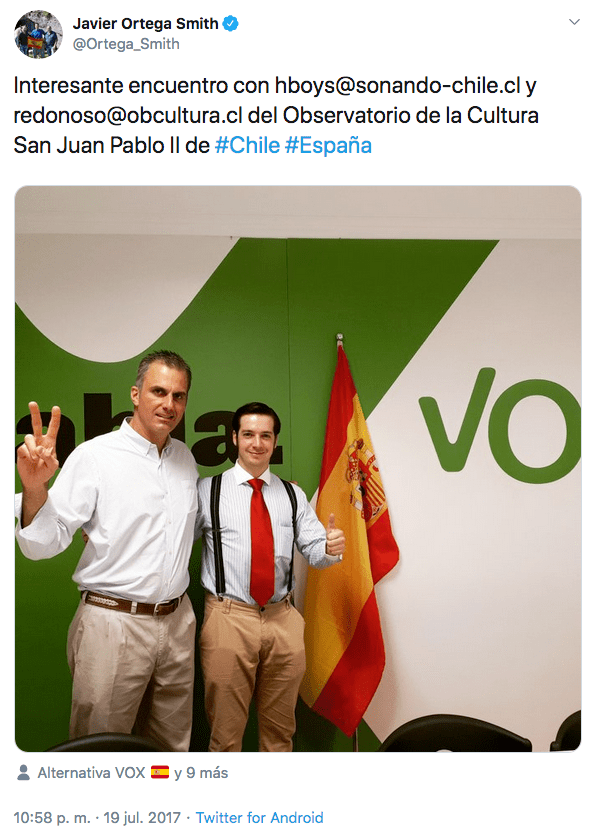 En esta foto de 2017 podemos ver a Javier Ortega Smith con Henry Boys, abogado que quiere acabar con el Marxismo en Chile y que promueve la castidad: «Practico la castidad hasta el matrimonio. De hecho, he terminado con pololas porque se nos hace difícil la castidad«. Este joven es el director del Observatorio de la Cultura San Juan Pablo II. Pues bien, el Director Ejecutivo de esta misma fundación es Rodrigo Donoso Baeza, quien, según «The Clinic«, es miembro y reclutador de El Yunque. De hecho, la misma fuente identifica a Henry Boys como antiguo miembro de El Yunque.