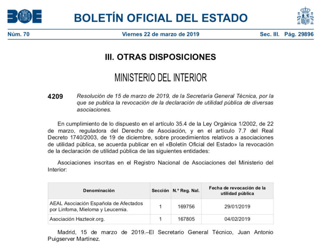 En mayo de 2019, seguían afirmando estar «declarada de utilidad pública por el Gobierno de España«, si bien en enero de 2020 ya han retirado esa información.