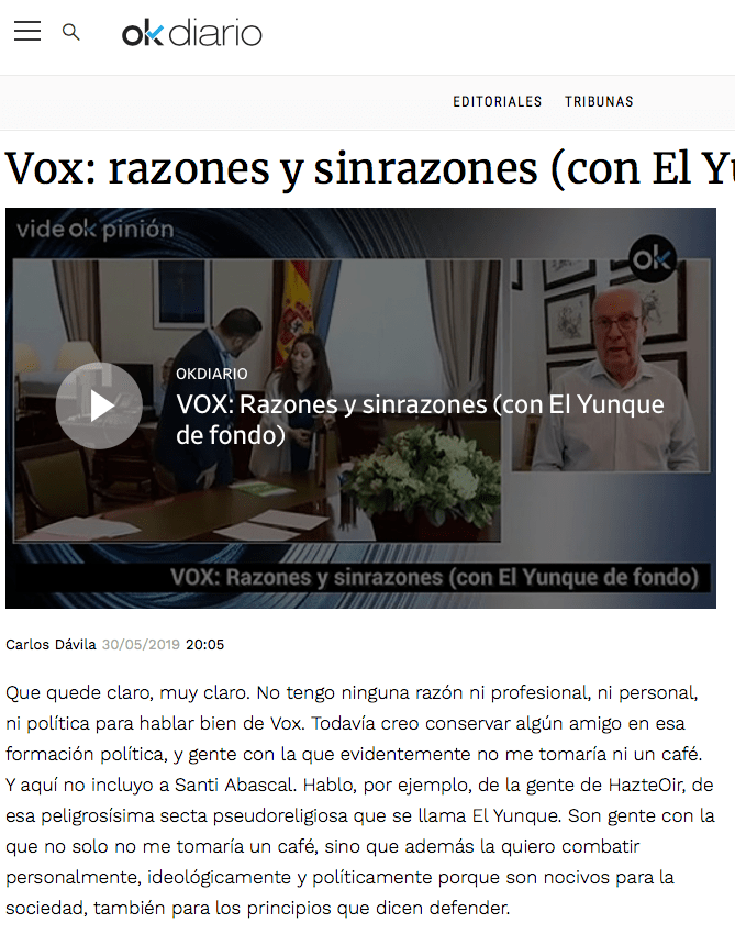 Que quede claro, muy claro. No tengo ninguna razón ni profesional, ni personal, ni política para hablar bien de Vox. Todavía creo conservar algún amigo en esa formación política, y gente con la que evidentemente no me tomaría ni un café. Y aquí no incluyo a Santi Abascal. Hablo, por ejemplo, de la gente de HazteOir, de esa peligrosísima secta pseudoreligiosa que se llama El Yunque. Son gente con la que no solo no me tomaría un café, sino que además la quiero combatir personalmente, ideológicamente y políticamente porque son nocivos para la sociedad, también para los principios que dicen defender.