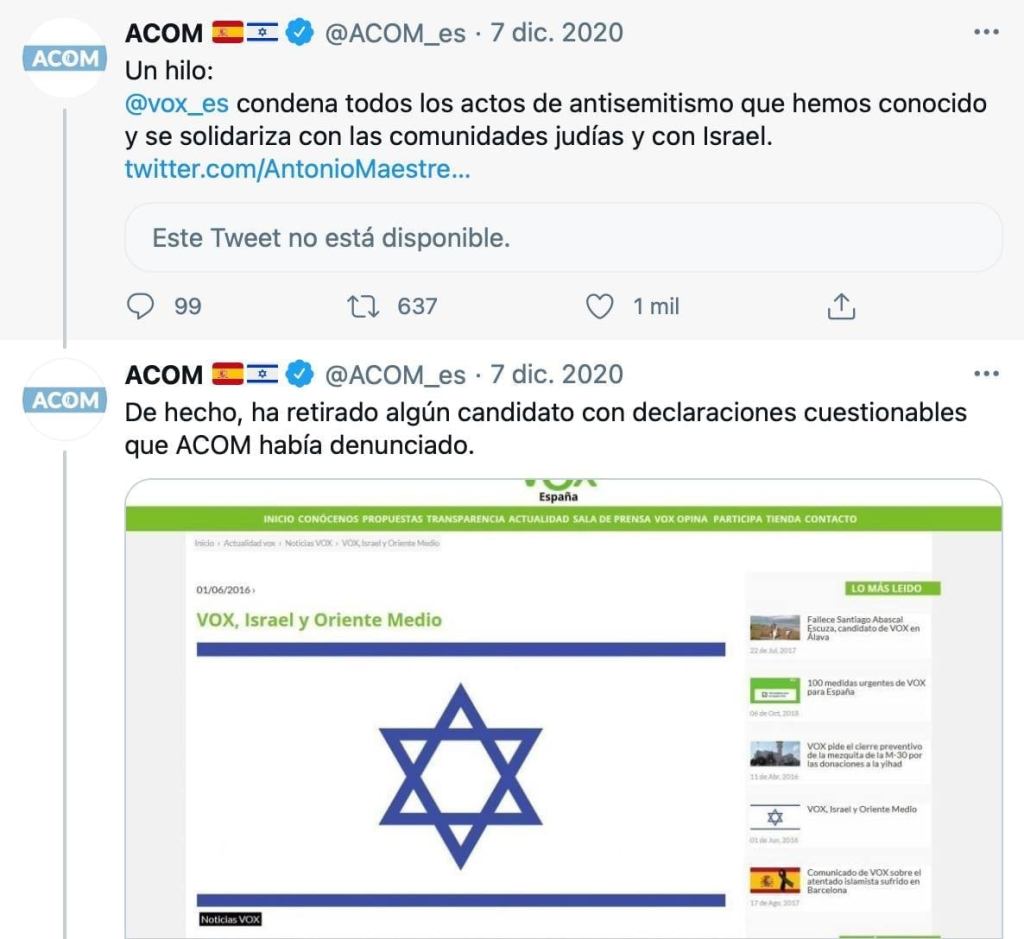 ACOM es consciente de que en VOX pueden entrar personas antisemitas, y ACOM no duda en exigir a “su” partido su depuración, a la vez que hace manifestaciones particularmente virulentas contra partidos de izquierdas.
