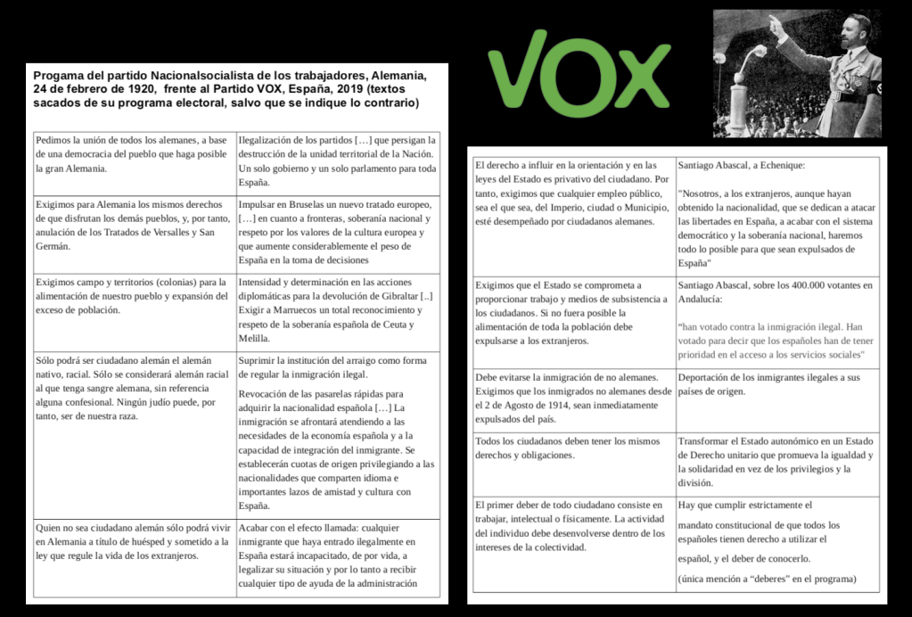 Por otra parte, es evidente, y así lo considera toda Europa (excepto ellos mismos y sus afines) que VOX es un partido de extrema derecha. Existen datos más que suficientes para calificarles así, y también para encontrar ejemplos de todas las características descritas anteriormente. De hecho, José Ovejero, en La Marea ha recopilado una lista de coincidencias entre el nazismo y VOX, también explicando que VOX no es nazi.